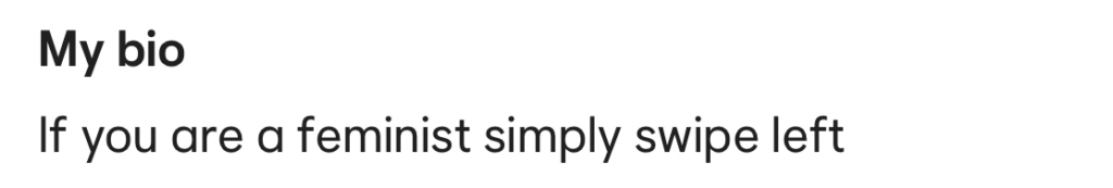 - Profile is entirely negative e.g. “no x type of women” or “if you’re x swipe left” (reason: appears close-minded or judgmental)