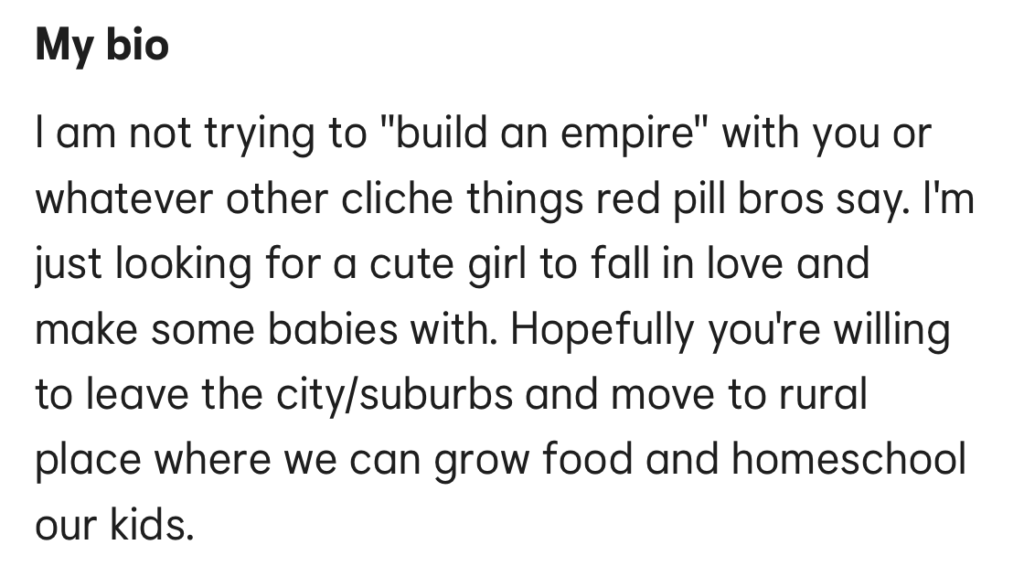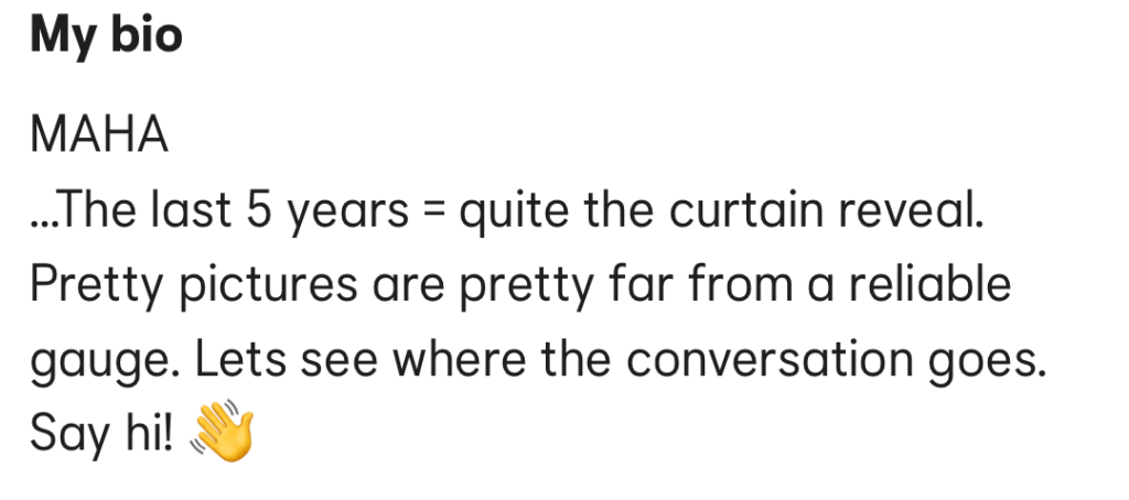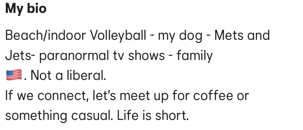 There’s a woman on TikTok who is publicly ruminating about the possibility of building a dating app solely based on matching with people who share your political affiliation. Dating apps unsurprisingly have a filter for politics. Many go so far as to call out this dealbreaker on their profiles more obviously, like this guy, whose primary profile picture I’ve cleverly disguised to protect his identity while still illustrating my point: