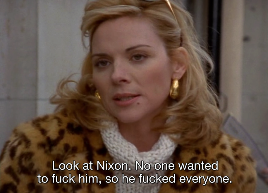 At one of their ubiquitous girl brunches, the four women get into a semi-comedic debate about their own voting records (Carrie isn’t even registered), who they vote for (Charlotte: whoever reminds her of her father), and what qualities are most important in a political candidate (Samantha: a man who is f*ckable, so he isn’t tempted to f*ck the country).