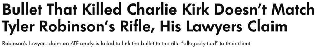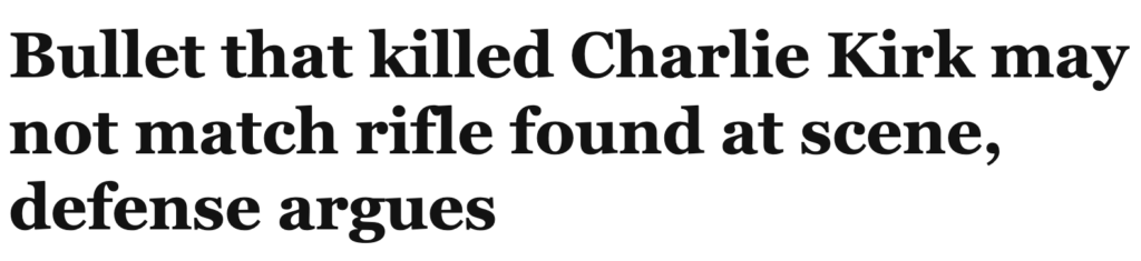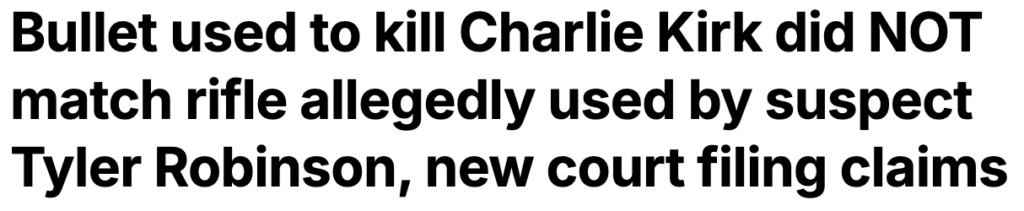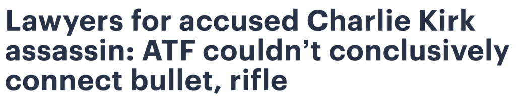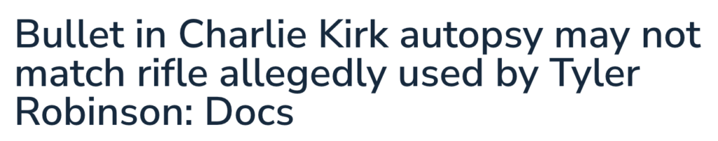 The bullet recovered from Charlie Kirk’s body broke on impact, resulting in it being badly damaged by his bones. This means that only a fragment of bullet was recovered, which immediately complicates any attempts to “match” the bullet to the gun that fired it. This does NOT mean that the bullet was conclusively not fired from the gun found at the scene (that was wrapped in a towel that contained the alleged assassin’s DNA). It similarly does NOT mean that it was fired from that gun either.